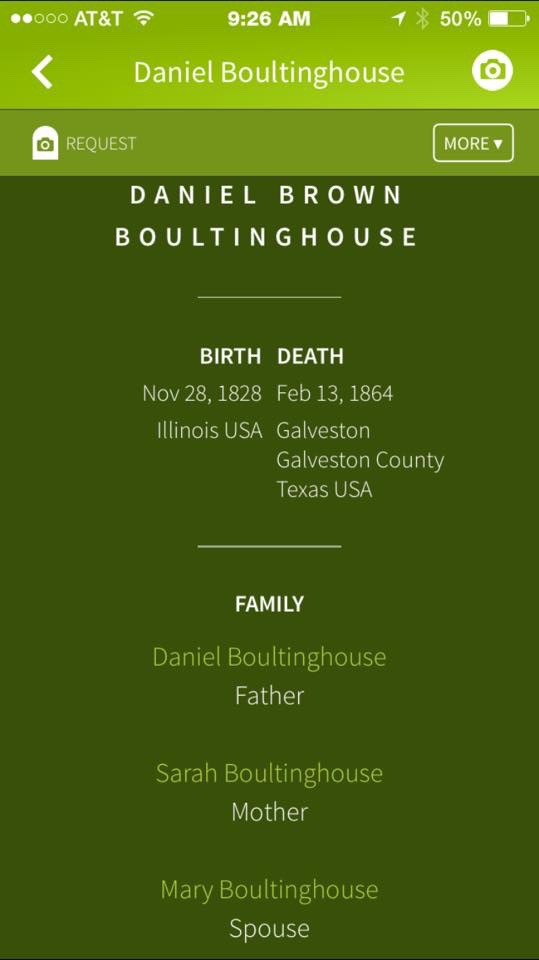 The father, Daniel Brown Boultinghouse it is believed died during the Civil War while he was in Galveston, in 1864. The mother died in 1866.
