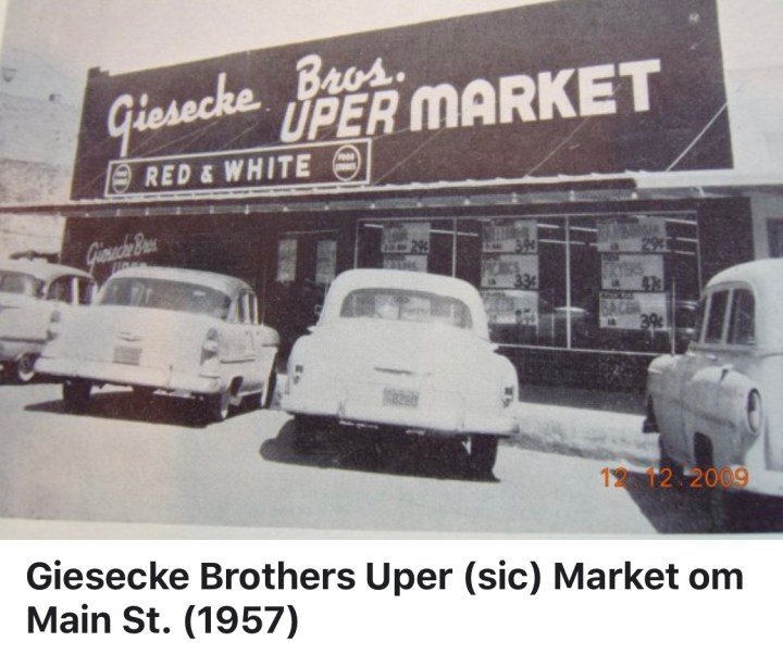 1. Giesecke’s Bros. Market was what I consider the first supermarket. Prior to that time there were several mercantile’s and small grocery stores. It was on Main Street in the block between Second and Third St’s on the east side of the street. I believe it was first owned by Rudolph Giesecke, but taken over by sons, Richard and Ralph at sometime in the 50s or 60s. (But I could be all wet on this)