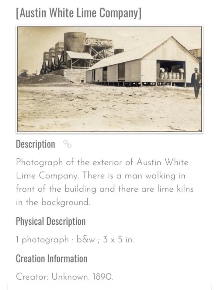 Photograph of lime kilns in McNeil One of the oldest businesses in Travis County is the Austin White Lime Company at McNeil. The first lime kiln was built in this northwestern part of the county around 1857, because of the limestone deposits there. In 1888 the plant was established as Martin and Walker, with A.F. Martin becoming the sole owner a year later. By this time the railroads had come and along with the ease of shipping the company prospered. In 1912, Alfred Robinson joined the company; today his family still runs the business. …portal to Texas History