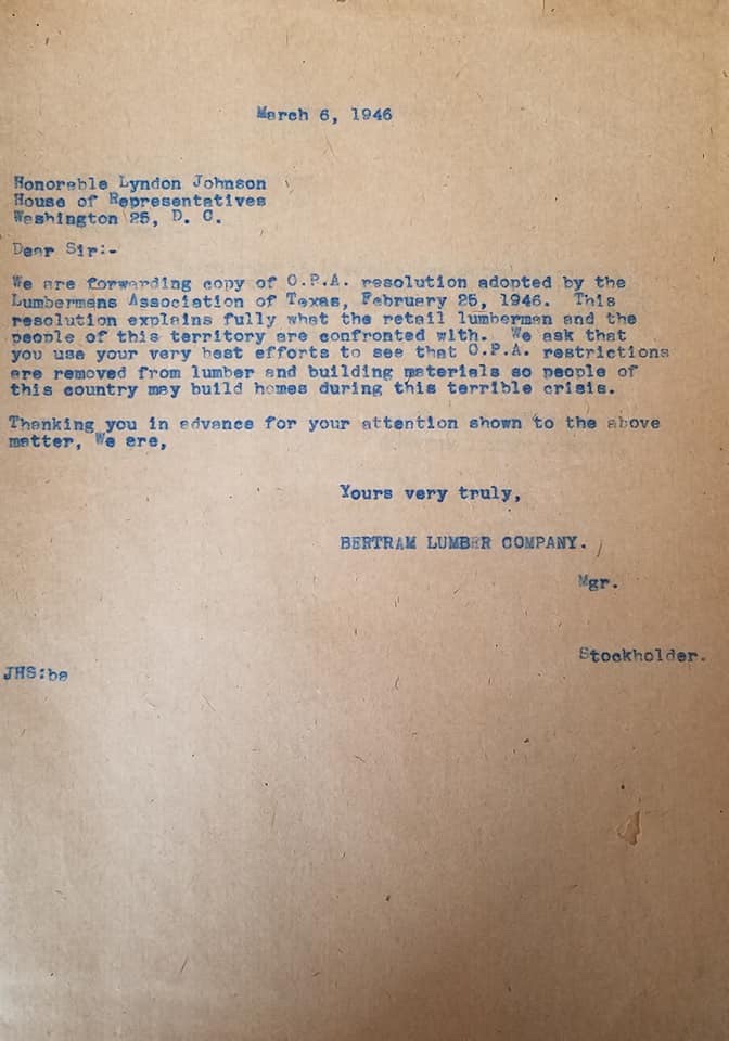 Below are 2 letters written by JH Sullivan to our Congressman at the time, Lyndon Baines Johnson.
