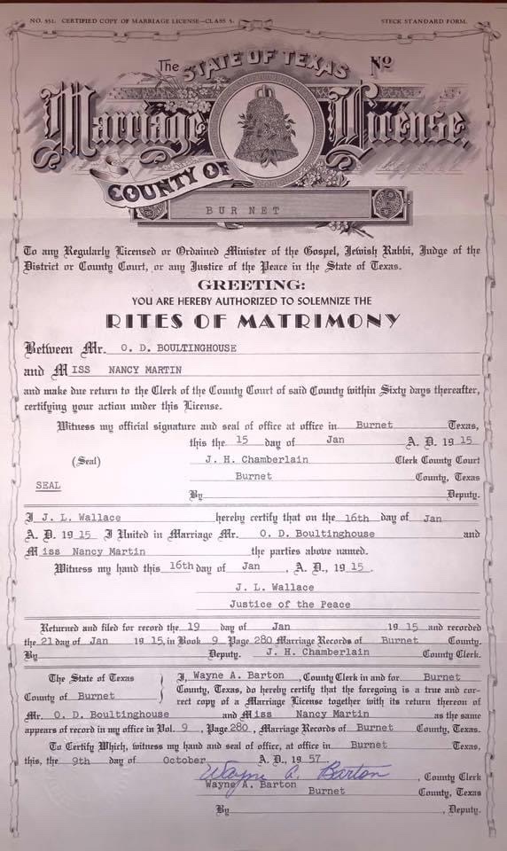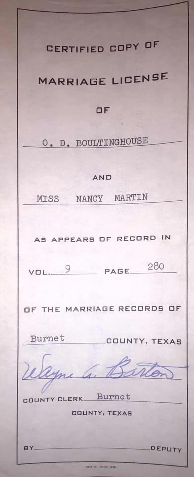 Much, if not all of their married life was spent in Smithwick. Nancy was a member of the Martin Family from Burnet. I think Delbert was raised primarily in Smithwick.