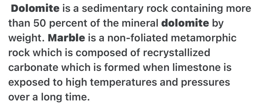 Dolomite has stunning hues of gray and white that resemble marble so closely sometimes they are mistaken for each other. Dolomite is a sedimentary rock made from limestone and lime mud that come in contact with groundwater that contains magnesium.