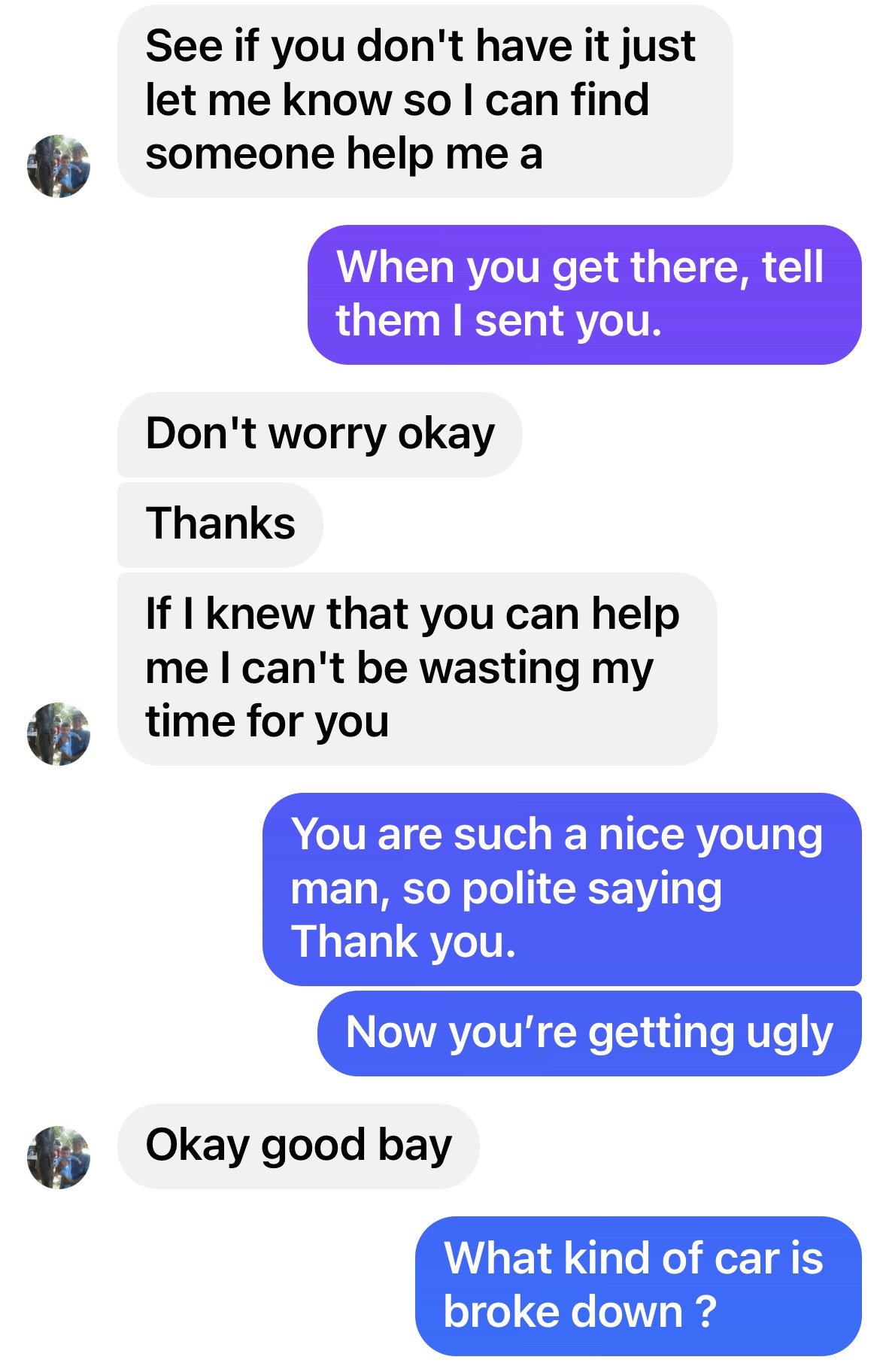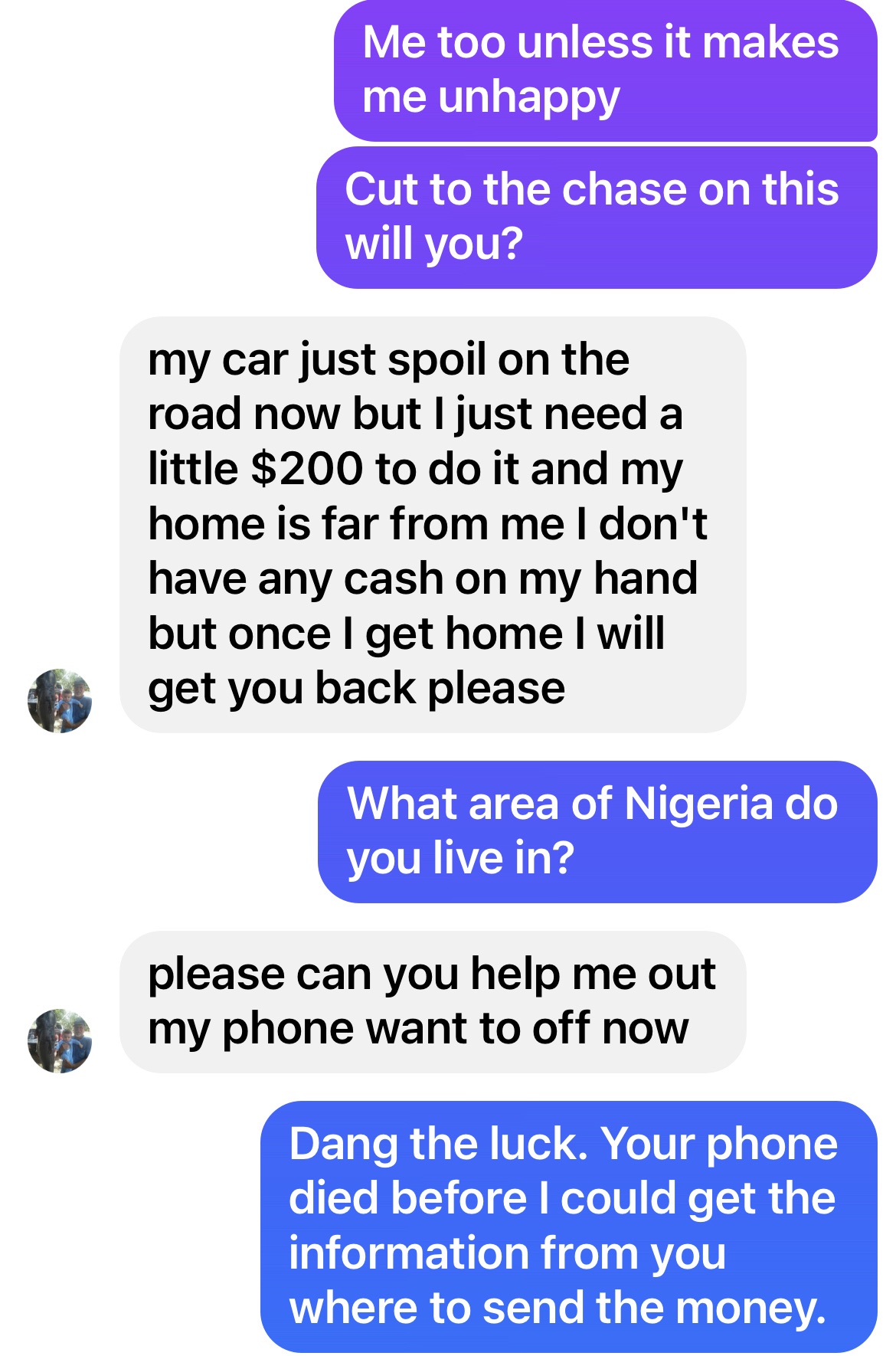 Another Daily Happening, Crazy Times, Thoughts and Musings They Contact You On FB Messenger And Want To Be Friends Before the ink dries on our new friendship agreement, he starts asking for a favor. That’s where the fun begins. Share this: Click to share on X (Opens in new window) X Click to share on Facebook (Opens in new window) Facebook More Click to email a link to a friend (Opens in new window) Email Like Loading...
