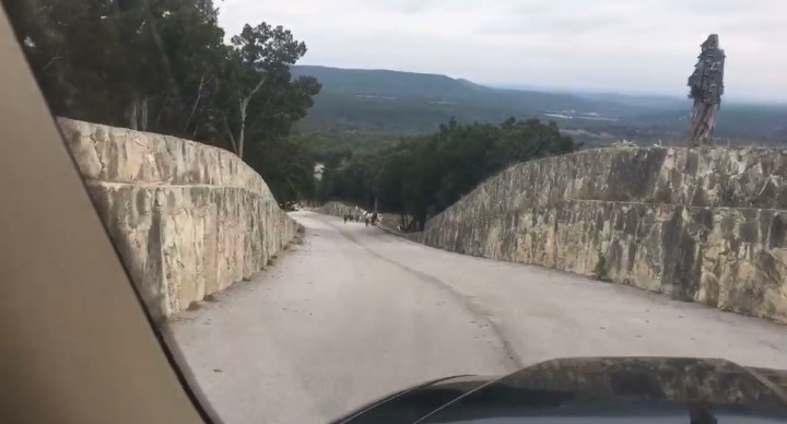 This was taken through the windshield as I was driving down his driveway one day. The bird condo is sitting prominently atop that rock retaining wall.