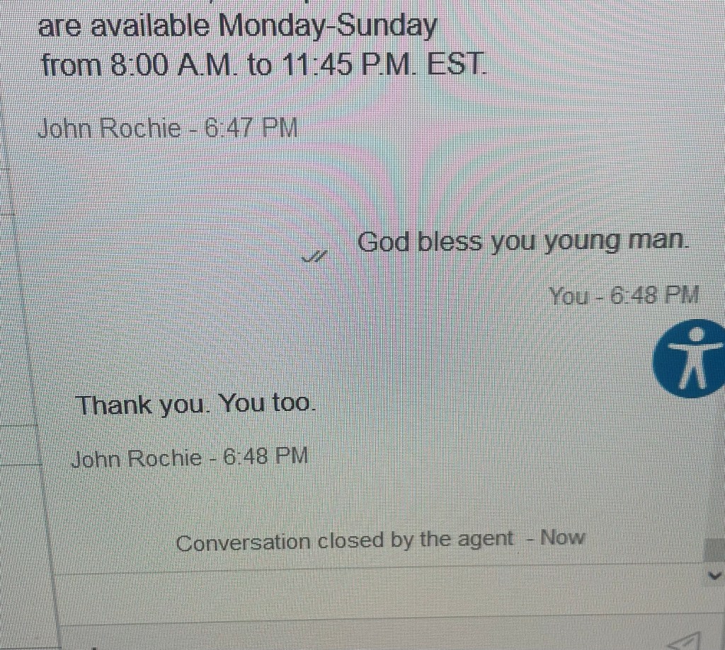 So I logged on to the company that I knew provided his service and went to work, “chatting” with what ended being a couple of different agents. 41 minutes later, I had what I needed.