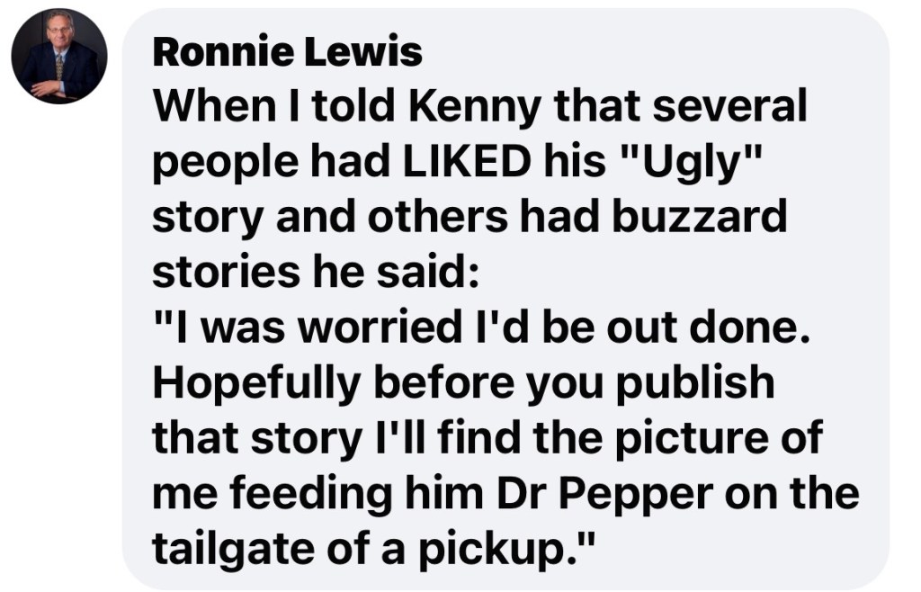 Larry hired George to be his ranch foreman; he was very experienced and familiar with all duties necessary to run a large game ranch. One of those duties was to inspect the many deer stands on the ranch regularly for critters ranging from wasp to owls. One day during his inspection he found a nest of young buzzard chicks in one of the stands. Knowing he would not be able to leave them there until they were old enough to fly, he decided to take them home and raise them. Unfortunately one didn’t make it but a few days and expired. That left him with only one; he named him “Ugly”. Over the next year, they became very close. Ugly followed him everywhere.