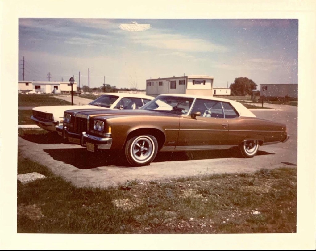 I finally ran across a picture of the White Dodge Demon. Well not a real picture of it but it’s parked next to the 1974 Grand Ville Pontiac that “We” traded for to replace the Demon with.