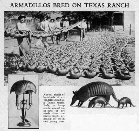 At Apelt Armadillo Farm, German immigrant Charles Apelt sits in front of his showroom while keeping an eye on the armadillos he caught and bred. The family enterprise included novelties made from armadillos such as baskets, lamps, wall hangings, and operated for about 70 years. Live animals were also sold to zoos, circuses and medical research facilities.
