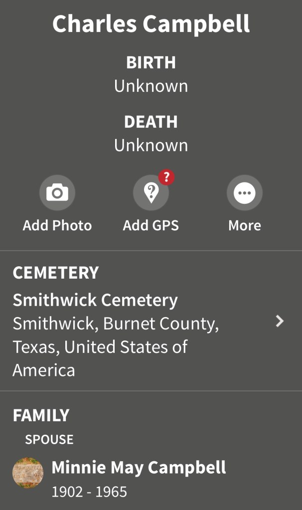 Seems that Dixie and Charlie had been in a traffic accident leaving him dead. I can’t remember for sure but I think they both were killed. The Travis County Sheriff’s Office didn’t know who to contact about the death, so the body stayed at the morgue for a couple of months. Just as they were ready to bury him in the county paupers cemetery, a Travis Co. investigator found some old mail in his room that had the old Marble Falls address on it. That’s how they found my Dad. Cecil took charge and brought him to Smithwick to be buried along side the love of his life, Minnie.