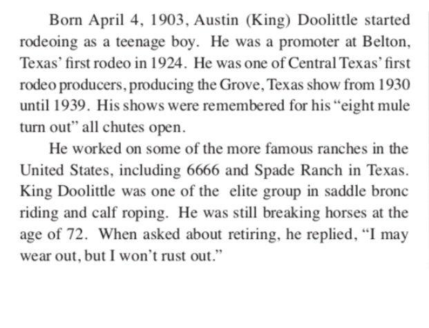 Early Rodeo Promoter and Ranch Hand on some of the big Ranches. He also went by “Cowboy” and “King“.
