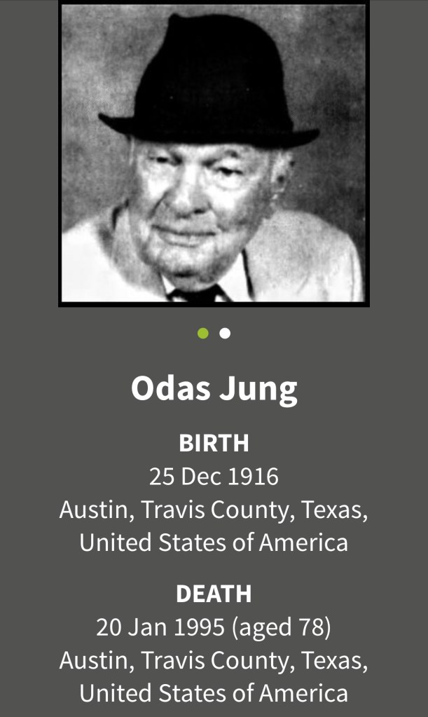 Back in 1970 or 1971 I was driving a truck. I hauled a load of precast concrete double tee beams from Victoria, Texas to a new building site off of Ben White Blvd, just a little east of South Congress. When I was sitting waiting to unload and an elderly gentleman drove up. He came over and introduced himself as Odas Jung. I always remembered him, 50 something years later. But I never encountered him again that I knew of.