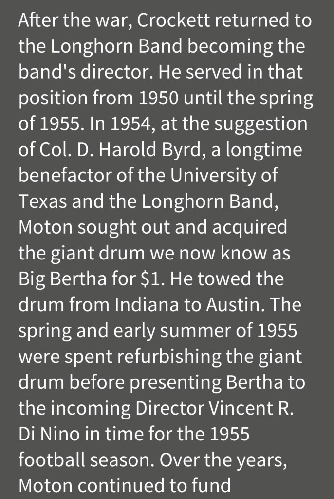 He is probably recognized by more people around Austin, than his father. Below is information taken from his obituary. While I never knew him personally, I’ve read the story of his bringing Big Bertha to The University of Texas.