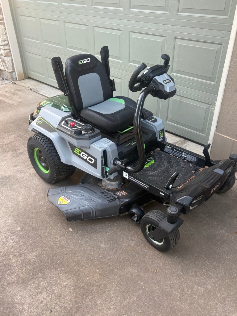 The reviews had good things to say about EGo riding mowers so a couple of Saturdays ago I went to Leander at the Lowe’s Store to look one over. After about two hours of wheeling and dealing they figured out they had a mower but no batteries for it. The folks there seemed a little befuddled as to what happened to the batteries. The model I choose, was a zero turn mower that has a steering wheel instead of the two long handles. It was the first time I had seen that. I took to that concept, because trying the mow and also drink my coffee was near impossible if you’re also trying to sip coffee.