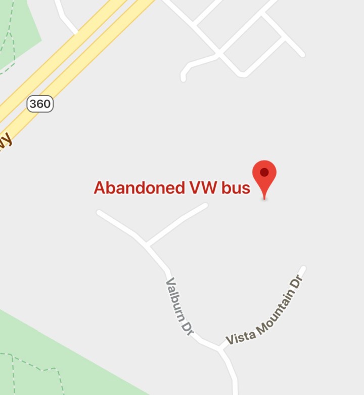 I posted about this incident on a Facebook Group in Austin. Someone told me about an old VW Bus that had been run off a cliff and left out in the Northwest Hills Area of Austin many years ago. It appears to still be there and has been a curiosity to many using the hiking trails in that area.
