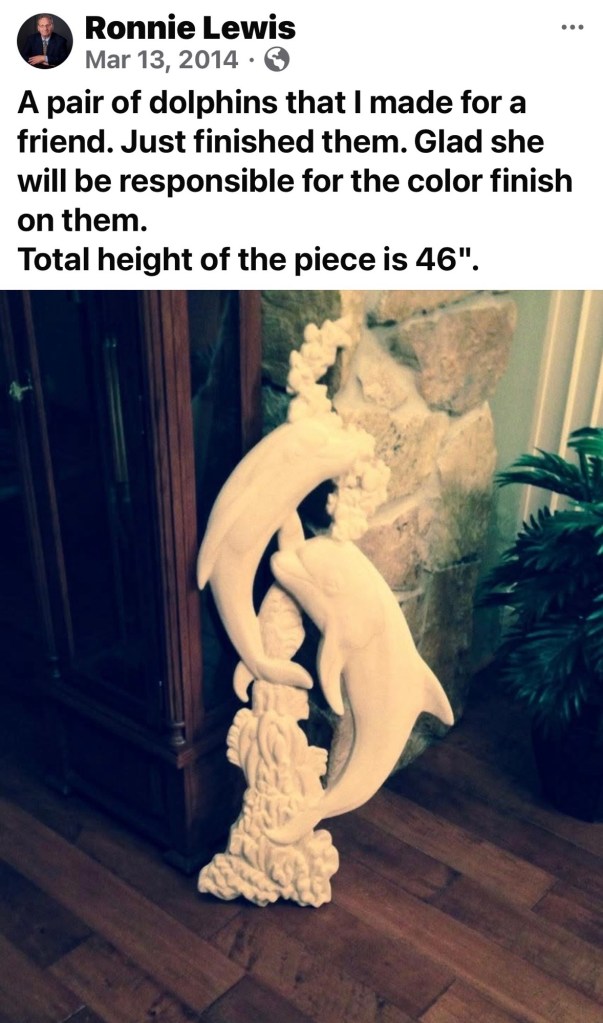 During our time living in Corpus Christi a few years ago is when I carved the largest of my projects, a pair of Dolphins. It was during a time when I was really suffering a lot of lower back pain. I received several steroid injections, was seeing a chiropractor often, but nothing was working. A very nice lady that lived out on The Island helped us with our interior decorating.